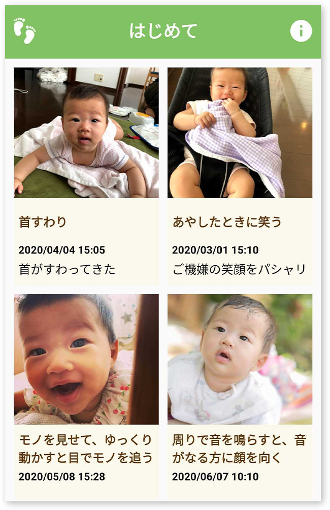 写真付きで、登録した子どもの成長の記録を家族で共有できます。
