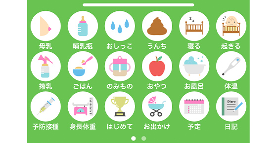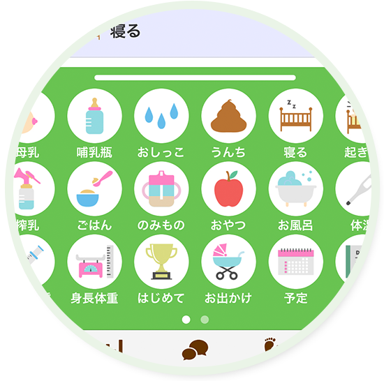 育児記録を簡単登録全30種類に増えた育児記録アイコン。
